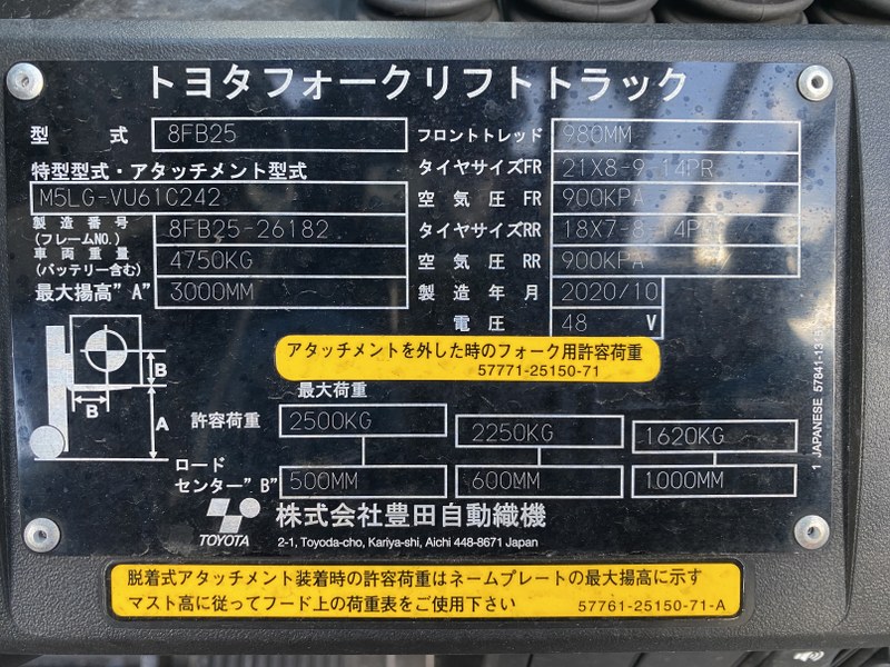 フォークリフト 17867 トヨタ 8FB25 2.5t バッテリーカウンター 回転フォーク/ベールクランプ