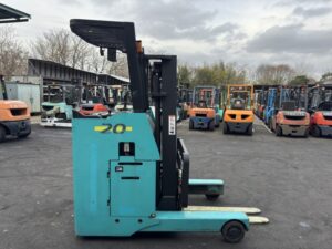 SUMITOMO 62-FBR20SJEは、屋内倉庫や物流拠点で活躍するバッテリー式リーチ車両です。揚高約3mの2段マスト仕様で中段ラックへの棚入れ作業を効率化できます。構内搬送から出荷準備作業まで幅広く対応し、限られた床面スペースを有効活用できる1台です。