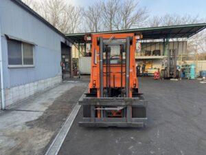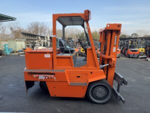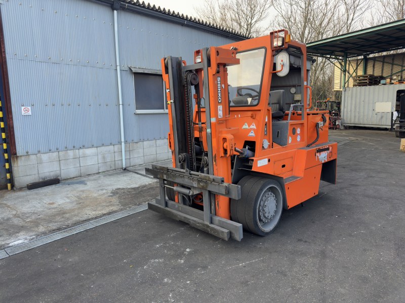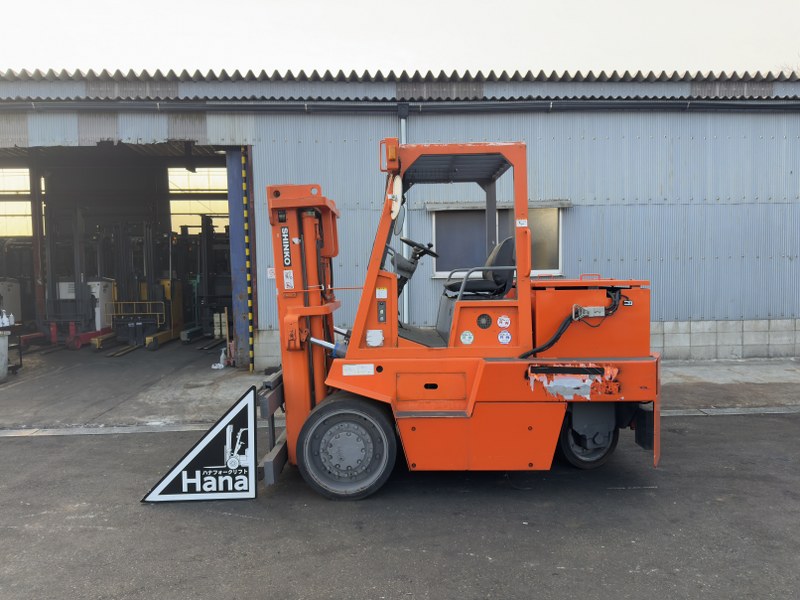 SINKO製バッテリー式フォークリフトです。2段マスト仕様・揚高約4mで中高段ラックへの棚入れや積み上げ作業に対応します。サイドシフト付きのため位置調整がしやすく、構内搬送や入出庫作業を効率化できます。現在は爪無し仕様のため、用途に合わせたアタッチメント装着を前提とした導入に適した1台です。