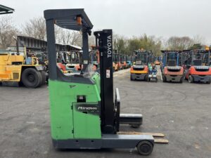 トヨタ製バッテリーリーチフォークリフト 8FBR15です。揚高約3mで棚入れやパレット搬送など日常的な荷役作業に対応します。920mmフォーク仕様で扱いやすく、倉庫内の構内搬送やピッキング作業を効率よく行えます。物流倉庫や製造現場で活躍する実用的なフォークリフトです。
