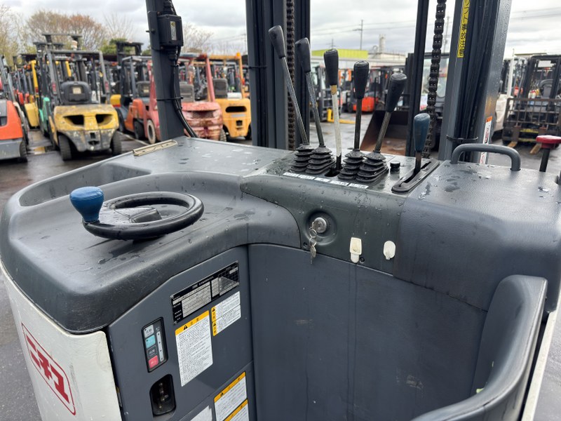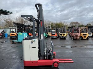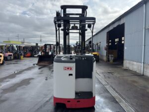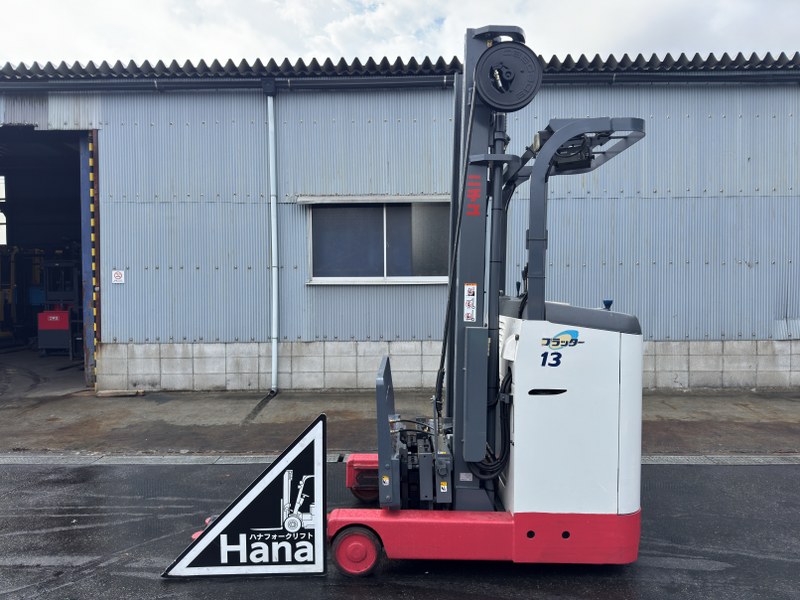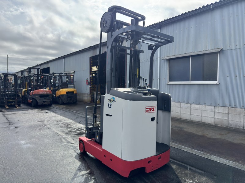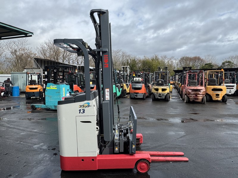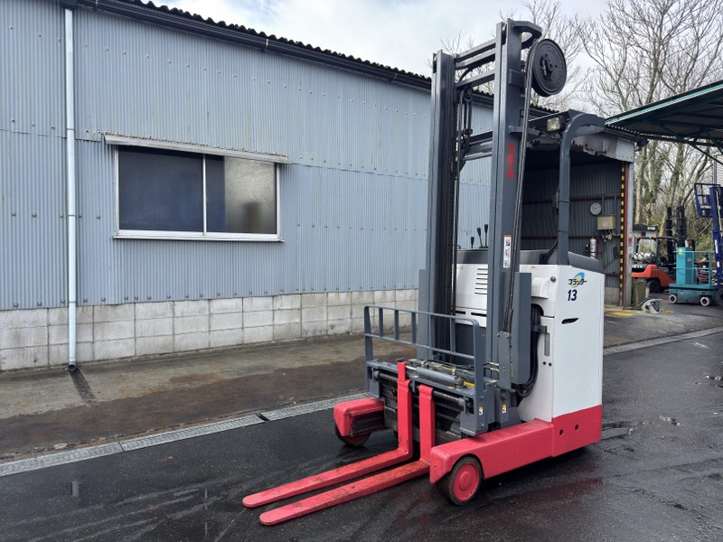 ニチユ製バッテリーリーチフォークリフト FBR13H-75-430SFFSAFです。揚高約4.3mで倉庫内の棚入れや高所ラックへの荷物の出し入れに対応します。サイドシフトとフォークシフト装備により荷物の位置調整やフォーク幅の調整がしやすく、さまざまなパレット作業に対応可能です。物流倉庫や配送センターでの入出庫作業に活躍する1台です。