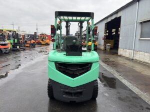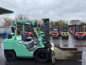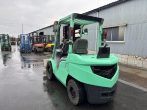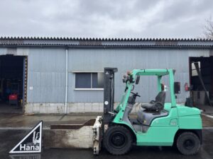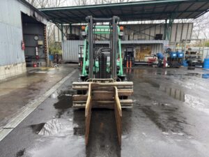 三菱製ディーゼルフォークリフト FD35ATです。揚高約3mで棚入れやパレット搬送など日常的な荷役作業に対応します。ベールクランプ装備によりパレットを使わない荷物の搬送が可能で、荷役作業を効率よく行えます。物流倉庫や工場、リサイクル現場など幅広い用途で活躍する実用的なモデルです。