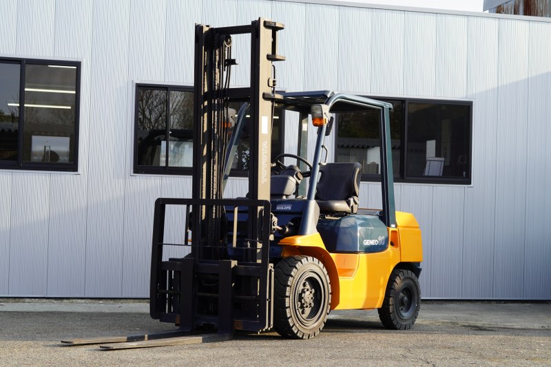トヨタ製ディーゼルフォークリフト 7FD30です。揚高約4mで棚入れやパレット搬送など幅広い荷役作業に対応します。サイドシフトと手動フォークシフトを備えており、荷役作業を効率よく行えます。1370mmフォーク仕様で長めの荷物にも対応し、物流倉庫や資材置場、工場内で活躍する実用的なモデルです。