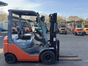 トヨタ製ガソリンフォークリフト 8FG15です。揚高約3mで入出庫作業やトラック荷役など幅広い荷役作業に対応します。1070mmフォーク仕様で扱いやすく、日常的な搬送作業を効率よく行えます。物流倉庫や資材置場、工場内で活躍する実用的なフォークリフトです。