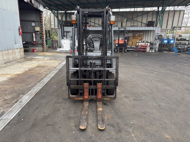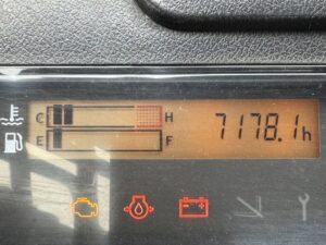 トヨタ製ガソリンフォークリフト 8FG15です。揚高約3mで倉庫内の棚入れやトラックへの積み込み作業に対応します。ヒンジ仕様のためパレット搬送に加え、砂利や残土などのバラ物運搬や傾斜作業も可能です。物流倉庫や資材置場、建設現場での荷役作業に活躍する1台です。