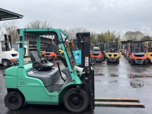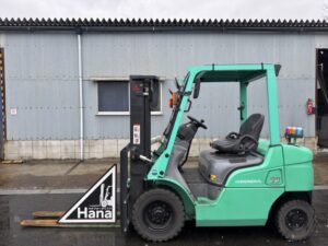 三菱製ディーゼルフォークリフト FDE20Dです。揚高約3mで入出庫作業やトラック荷役など日常的な荷役作業に対応します。1370mmフォーク仕様で扱いやすく、物流倉庫や資材置場、工場内の構内搬送など幅広い現場で活躍する実用的なモデルです。