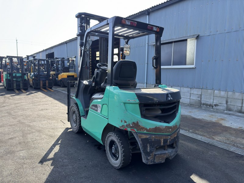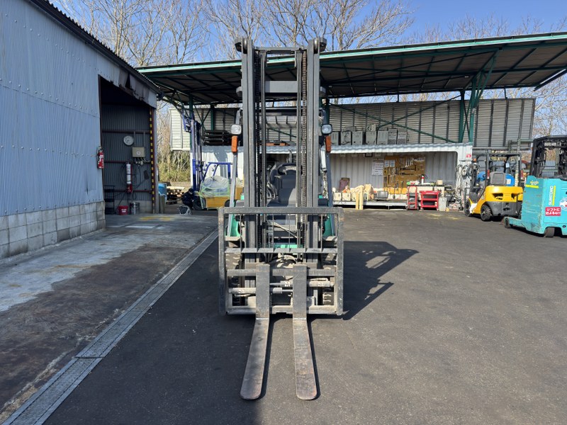 三菱製ディーゼルフォークリフト FDE25P-Xです。揚高約4mで倉庫内の棚入れや高所ラックへの荷物の出し入れに対応します。フォークシフト装備によりフォーク幅の調整ができ、さまざまなパレット作業に対応可能です。1220mmフォーク仕様で安定した搬送ができ、物流倉庫や工場での入出庫作業に活躍する1台です。