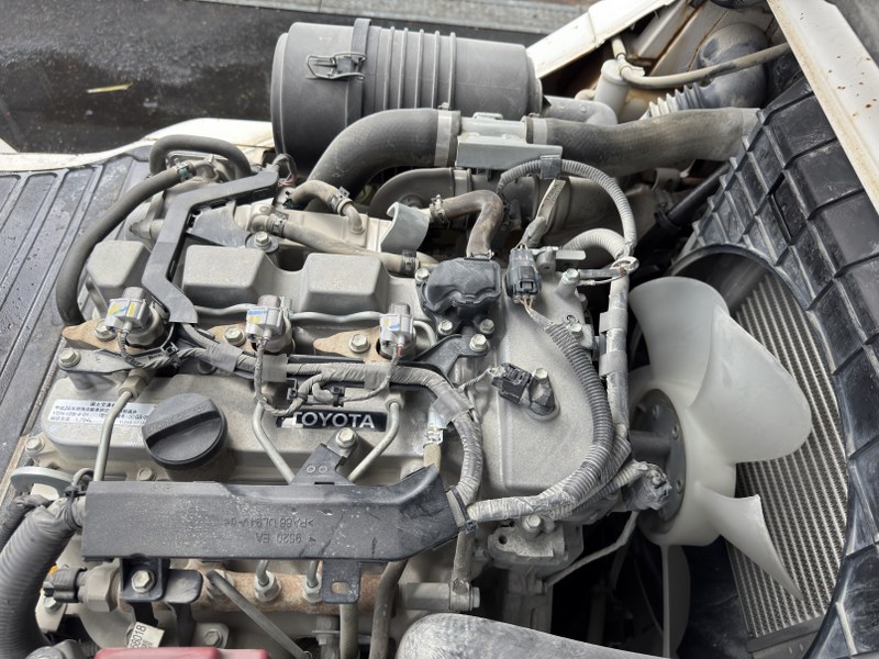トヨタ製ディーゼルフォークリフト 02-8FD25です。揚高約3.5mで倉庫内の棚入れやトラックへの積み込み作業に対応します。フォークシフト装備によりフォーク幅の調整が可能で、さまざまな荷物に対応できます。2200mmのロングフォーク仕様で長尺物や大型資材の搬送にも適した1台です。