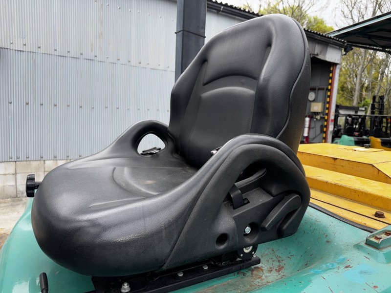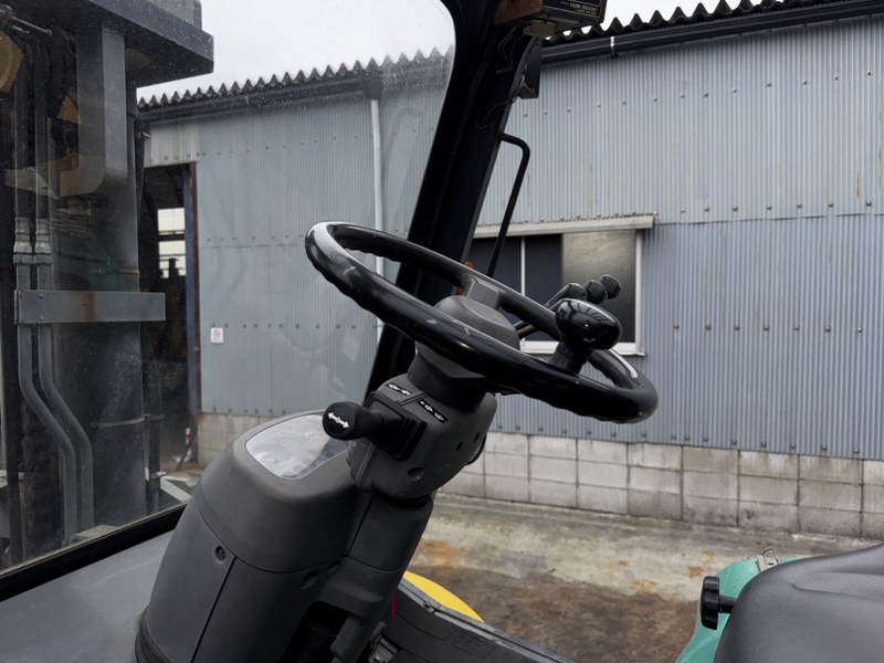 本車両は、8.0tの最大荷重を支えるために前輪にダブルタイヤを採用しており、不整地や重量物吊り上げ時でも抜群の安定感を誇ります。さらに、このクラスでは必須ともいえるフォークシフトを搭載。重たい爪を動かすことなく、運転席からレバー一つでフォーク間隔を調整可能です。