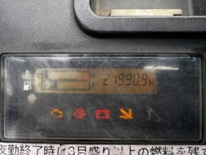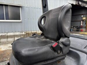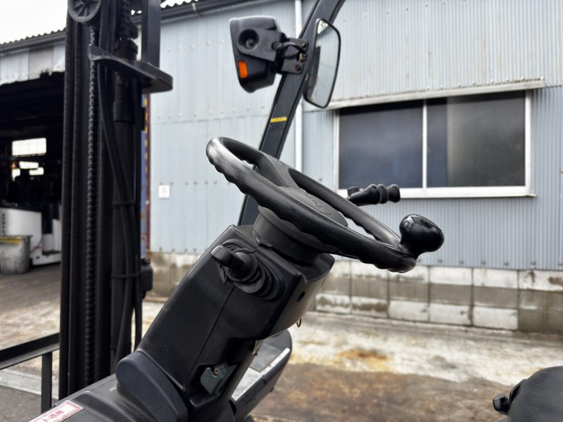 本車両の最大の特長は、フォークシフターを搭載している点です。パレットのサイズや荷物の幅に合わせて、運転席に座ったままレバーひとつで爪の間隔を左右に開閉できます。手動で重い爪を動かす重労働や、車両から乗り降りする回数を大幅に削減できるため、荷役作業のスピードが劇的に向上します。